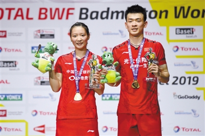 8月25日,中国组合郑思维(右)/黄雅琼在颁奖仪式上。当日,在瑞士巴塞尔举行的2019年世界羽毛球锦标赛混合双打决赛中,中国组合郑思维/黄雅琼以2比0战胜泰国组合德差蓬/沙西丽,夺得冠军。