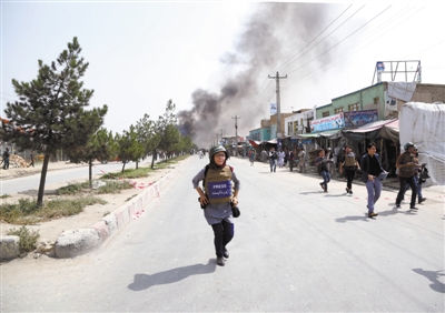 9月3日,在阿富汗首都喀布尔,一名记者从袭击地点附近撤离。阿富汗警方3日证实,2日晚间首都喀布尔的一处外国人居住区遭汽车炸弹袭击,造成16人死亡、119人受伤。 新华社 发