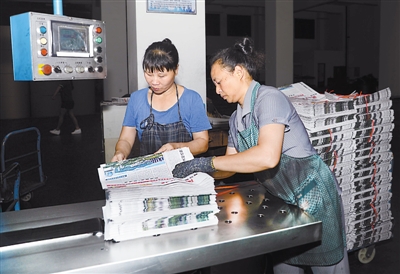 工人捆扎印好的报纸。