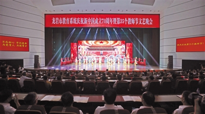昨晚,庆祝新中国成立70周年暨第35个教师节文艺晚会在龙岩人民会堂隆重举行。本次晚会由中共龙岩市委教育工委、龙岩市教育局主办,我市高校、高职院校、职专、各县(市区)教育系统和市属中小学校的师生们共同呈现了一场精彩的演出。许维泽、张天洲、黄福清等市领导与教师们一同观看演出。