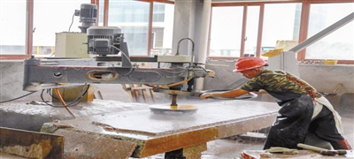 永定石材循环经济产业园今年4月中旬开工生产,生产的各个环节达到“粉尘不外扬,污水不外排”的环保要求。产业园位于洪山乡,面积3000亩,总投资27.5亿元,分三期建设,同步建设污水处理厂、工业循环用水池和石粉综合开发利用厂等环保配套设施。图为近日,产业园工人生产场面。