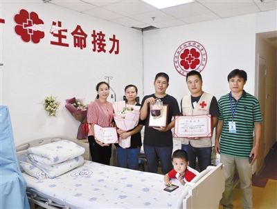在福州肿瘤医院的造血干细胞采集室里,邹诚炜手拿10克造血干细胞悬液。