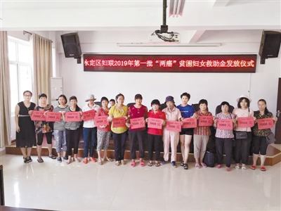 永定区妇联举行2019年第一批“两癌”贫困妇女救助金发放仪式。此次得到救助的“两癌”贫困妇女共18人,每人领到资助金3000—5000元不等,共7.07万元。 通讯员 刘琦 摄