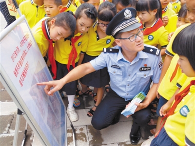 为切实强化铁路护路联防工作,确保辖区安定稳定和铁路安全畅通,连日来,永定区委政法委组织区护路办工作人员、永定铁路派出所民警,分别前往城区铁路沿线各中小学校开展送安全知识进校园活动,旨在增强广大师生安全防范意识和爱路护路积极性,构筑铁路护路安全“防护网”。图为9月6日,民警在城东小学通过宣传展板面对面向学生讲解相关安全防范知识的情景。 通讯员 李添华 吴丽萍 摄
