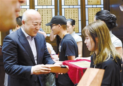 9月17日,故宫博物院院长王旭东(左)为金奖获得者颁奖。当日,“发现‘中纹’之美——首届中华符号数字化创意设计大赛”颁奖仪式在北京故宫博物院举行。本次大赛于3月28日启动,分为“中华符号全国征集大赛”和“中华符号创意设计大赛”两个阶段,最终评选出优胜作品33份,其中图形图案类17份,办公应用类7份,创意字体类9份。 新华社记者 金良快 摄