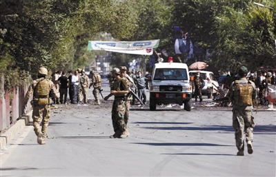 9月17日,在阿富汗首都喀布尔,急救车抵达发生爆炸的地点。阿富汗警方发言人17日说,阿首都喀布尔第9警区美国大使馆附近发生一起爆炸,目前伤亡情况不明。