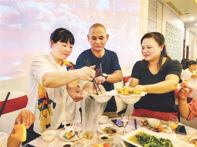 24日,在中心城区荣顺国际酒店,宾客们在婚宴酒席结束后,正打包剩下的菜品。