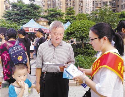 近日,新罗华莲社区组织共建单位志愿者在家和天下小区开展庆祝新中国成立70周年活动,活动现场还进行了垃圾分类、防电信诈骗、禁毒、扫黑除恶等宣传。图为志愿者给居民发放宣传单。 记者 刘耿剑 通讯员 陈红蕊 摄