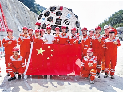 日前,在新罗区西陂街道南石村龙岩市2019年“重中之重”项目——万安溪引水工程隧洞前,EPC总承包单位黄河勘测规划设计有限公司的100多位建设者,在即将进洞开挖的“龙岩号”TBM掘进机前与国旗合影,他们在国庆放假期间坚守岗位,奋战在掘进一线。 记者 郑秋生 摄