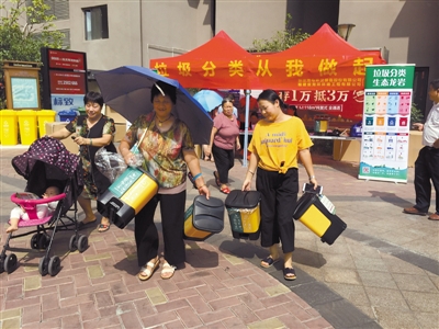 10月9日,万达华城小区居民将分类垃圾桶领回家