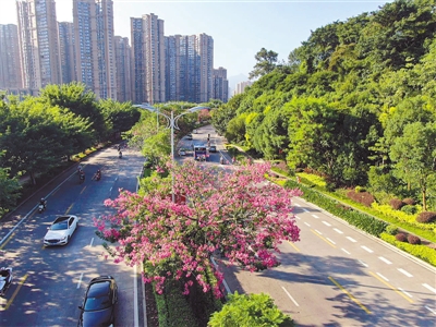 近年来,我市园林部门做好园林绿化提升工程,精心打造“乔木为主、四季常青、四季有花、乔灌花草搭配、高低错落有致”园林式景观,在莲庄路、龙腾南路、华莲路等路段引进数百株高大的热带花树美人树,每到秋天,美人树妖艳绽放,在绿韵蓝天白云中极为赏心悦目,成为龙岩城市秋天生态美景。图为日前开花的莲庄路美人树一树繁花点缀着绿色街景的画面。