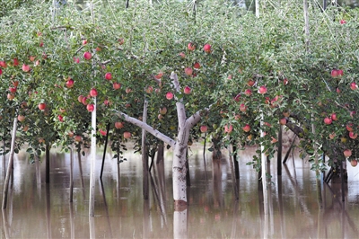 10月13日,日本长野县千曲川决堤后水流侵袭了附近的苹果树。受今年第19号台风“海贝思”带来的强降雨影响,日本中部长野县一河流13日凌晨发生溃堤,淹没大片民宅和农田,致百余人受困。据日本媒体统计,截至目前,“海贝思”已至少导致10人遇难、16人失踪、128人受伤。 新华社记者 华义 摄