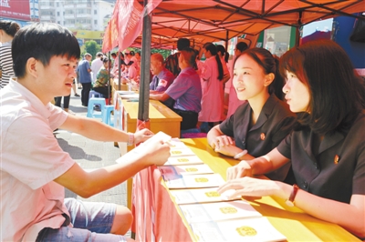 日前,龙岩市新罗区人民法院举办“进百家门、访百家情、解百家难,安百家心”司法进社区活动,干警们深入各挂钩村居,访贫问苦,送上“法律快餐”,得到群众赞誉。图为近日,该院干警在社区设点,服务百姓时的情景。通讯员 简华良 摄