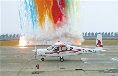 10月28日,RX4E飞机首飞结束后降落在沈阳财湖机场。当日上午,随着一阵轰鸣声,我国自主研制的首架四座电动飞机RX4E飞机冲破风雨,在辽宁沈阳财湖机场首飞成功。四座电动飞机RX4E飞机是由辽宁通用航空研究院全新研制的新能源通用航空产品,飞机翼展13.5米,机长8.4米,起飞重量达1200公斤,续航时间1.5小时,航程300千米。后续随着电池储能技术的发展,航时航程可进一步提升。 新华社记者 杨青 摄