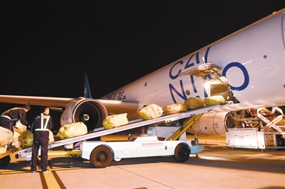 10月30日凌晨,“菜鸟号”货机停在杭州萧山国际机场装货。当日,浙江杭州飞往俄罗斯首都莫斯科的首条直达电商货运航线“菜鸟号”从萧山国际机场首航。据介绍,该航线由阿里巴巴旗下物流平台菜鸟网络运营,每日定期飞行1至2个航班。