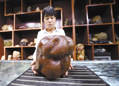 海伦市奇石协会的工作人员展示在海伦发现的大叶草化石(10月24日摄)。我国三名古生物学专家经过认真考察,在对黑龙江省绥化海伦市发现的一系列植物、动物化石的研究中发现了这里的一个罕见的白垩纪生物群。这个古生物群的生物种类丰富,包括蕨类植物茎干化石、裸子植物的木化石以及恐龙化石和鳖化石等。 新华社 发