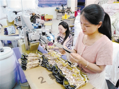 永定区人力资源和社会保障局积极探索“企业+就业扶贫车间+贫困户”等模式,设立厂房式扶贫车间、居家式扶贫车间、农业合作社式扶贫车间,今年已经吸纳近百名贫困家庭劳动力、留守妇女在家门口就业创业,实现家庭、生产、就业“三不误”。图为永定区培丰镇留守妇女近日在一家针织厂上班。