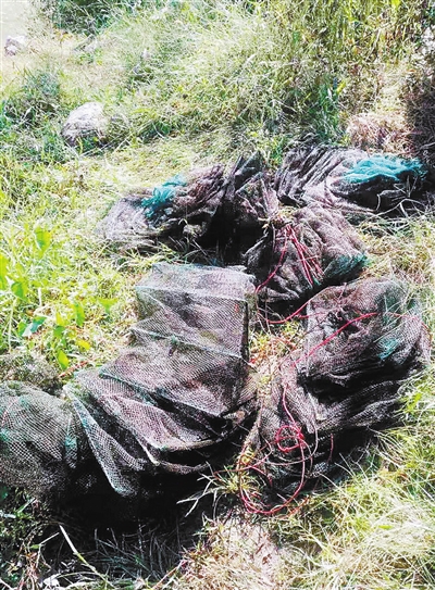 日前,连城县姑田镇河长办河道专管员在开展河道巡查工作时,发现一处河段有人违规布设多组捕鱼笼网,当即下河收缴并集中销毁。这是该镇对违规掠夺溪鱼资源,破坏河道生物链和生态环境行为的一项立竿见影整治举措。图为收缴的捕鱼笼网。