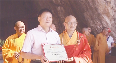 11月4日,武平县岩前镇均庆院古佛殿阳光普照,乐捐海峡两岸交流基地均庆院功德主牌匾、证书颁发仪式在此举行。乐捐1万元以上的功德主、海峡两岸交流基地服务中心等负责人、善信代表等百余人参加活动。 通讯员 林娟 摄