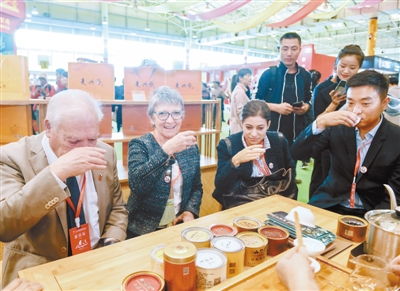 11月16日,几位来自法国的客商在茶博会上品茶。当日,第十三届海峡两岸茶业博览会(简称“茶博会”)在福建省武夷山市开幕。本届茶博会设有“茶民宿”“茶文化”“茶养生”“茶器具”“茶食品”“茶设备”等主题,吸引众多海内外客商前来交流洽谈、寻找商机。 新华社记者 宋为伟 摄