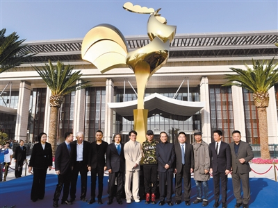 11月19日,嘉宾在第28届金鸡百花电影节金鸡雕塑揭幕仪式上合影。当日,第28届金鸡百花电影节金鸡雕塑揭幕仪式在厦门海峡大剧院前广场举行。第28届中国金鸡百花电影节暨第32届中国电影金鸡奖将于11月19日至23日在福建省厦门市举办。新华社记者 姜克红 摄