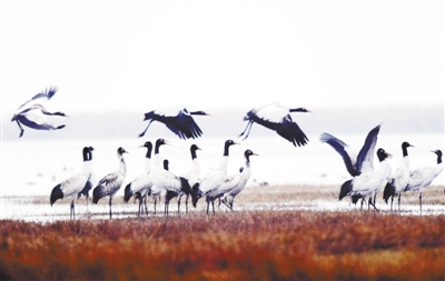 12月11日在贵州草海保护区拍摄的黑颈鹤。近日,大批候鸟陆续飞抵贵州草海国家级自然保护区越冬。草海管理委员会12月11日监测数据显示,目前已有黑颈鹤1500余只、灰鹤560余只、斑头雁2400余只及其他候鸟飞抵草海越冬。近年来,随着草海加大生态环境保护力度,前来此地越冬的候鸟逐年增多。 新华社记者 杨文斌 摄