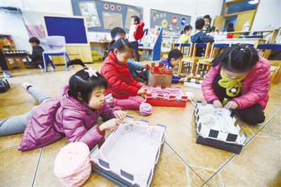 12月11日,小朋友们在老师的带领下编织爱心围巾。近日,浙江大学后勤集团幼教中心西溪幼儿园开展“编织爱心围巾送温暖”活动。小朋友们在老师的带领下编织毛线围巾和帽子,并将于12月中旬把它们寄给西藏自治区山南市结对幼儿园的孩子们,传递冬日里的温暖。 新华社记者 徐昱 摄