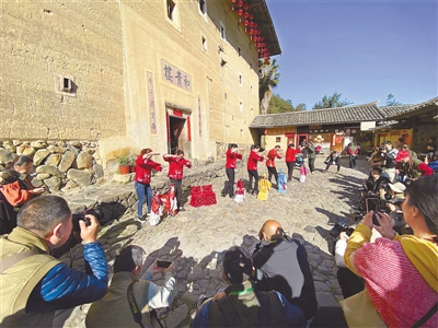 世界文化遗产南靖和贵楼前举行木偶表演。