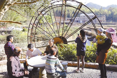 上杭县白砂镇碧沙村是革命基点村和中央红色交通线沿线村,去年以来,该村筹资500多万元,实施美丽乡村建设,修复天后宫、丁甘如将军故居、红色交通线丁正昌号商铺,设施通村道路白改黑工程、修建沿河步道、村口农民公园等项目,昔日破败不堪的村庄成为兼具“红、古、绿”三色的生态小康村庄,每到周末吸引大批市民驴友前来观光。图为昨日该村群众在村口农民公园休闲。 记者 傅长盛 摄
