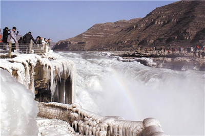位于秦晋大峡谷的黄河壶口瀑布,冬日水量较夏日虽然有所减少,但惊天动地的涛声依旧,周围石壁上的冰挂与河中的浪涛构成一幅独特的北国风光图,吸引游客前来观赏。 (新华网)