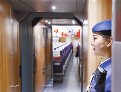 12月29日,乘务人员在由银川站开往中卫南站的C8201次列车上迎接乘客。当日,宁夏银川至中卫段高铁开通运营,宁夏由此结束没有高铁的历史。银中高铁线路全长207公里,最高设计时速250公里,全线共设银川、吴忠、中卫南等7座车站。银川到中卫的高铁通行时间约1个半小时,较普通旅客列车节省1个多小时。
