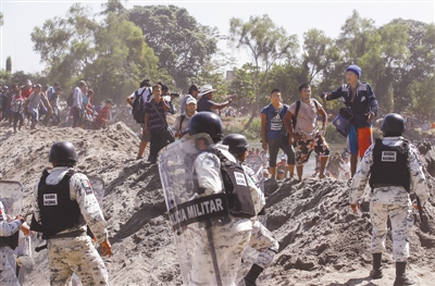 1月20日,在位于墨西哥与危地马拉边境的苏恰特河附近,来自中美洲的移民在试图进入墨西哥时受到墨西哥国民警卫队的拦阻。近日,大量来自中美洲国家洪都拉斯、萨尔瓦多和危地马拉的移民抵达危地马拉和墨西哥的天然边界苏恰特河,试图进入墨西哥,北上赴美。 新华社发