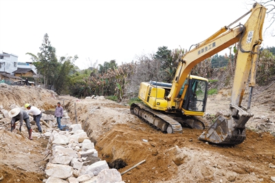 16日上午,工人正在永定区古竹乡陂子角村紧张施工。该乡充分利用土楼、古榕树等元素,结合万里安全生态水系建设,投入200多万元,在陂子角村建设占地5000多平方米的古榕树文化公园。公园建成后,将成为政策宣讲、村民休闲的又一处好场所。