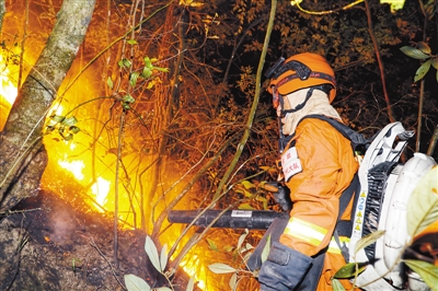 2月1日傍晚,上杭县湖洋镇一处山头突发山火。龙岩市森林消防支队上杭大队闻令而动,47名指战员赶赴火场一线展开扑救。灭火作战中大队做好疫情防控措施的基础上妥善处置火情,成立党员突击队,经过两个多小时鏖战成功将山火扑灭。图为,山高坡陡队员艰难作战。