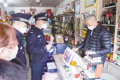 1月31日,龙岩市公安局新罗分局民警联手多部门对店主疫情防控宣传开展巡查。