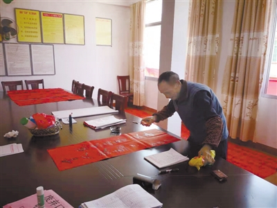 “疫情就是命令,防控就是责任”“今天到处串门,明天肺炎上门”“拜年不利防疫,聚餐就是危险!”近日,永定区金砂乡西田村村内的主要公共场所、大街小巷,都能看到一幅幅手写的肺炎疫情防控宣传标语,十分醒目,通俗易懂,这都出自65岁的老党员张新成之手。图为近日张新成在书写疫情防控宣传标语。