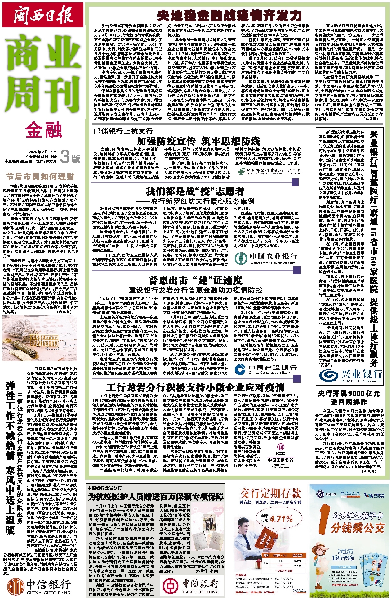 自新型冠状病毒感染的肺炎疫情暴发以来,中信银行龙岩分行坚决贯彻党中央、集团、总行和福州分行及各级政府和监管部门对于疫情防控工作的要求,为抗疫、防疫持续提供金融保障服务。疫情期间,该行各职能部门提供7×24小时业务支持保障承诺,全员在岗,离行不离岗,确保各项业务正常开展。