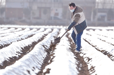 2月12日,上蔡县邵店镇刘岳村村民在加固马铃薯地膜。近日,随着气温逐步回暖,河南省上蔡县农民在做好个人防护措施的同时,紧抓农业生产,积极开展作物田间管理。