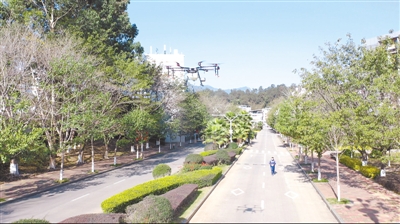 在疫情防控期间,龙岩学院安排每天对校园进行全面消毒杀菌,确保校园整洁、卫生、安全。图为2月18日龙岩学院校企合作单位——通图无人机飞行学院应邀免费对龙岩学院校园进行无人机空中喷洒消毒作业。 记者 王尚华 通讯员 黄德民 摄