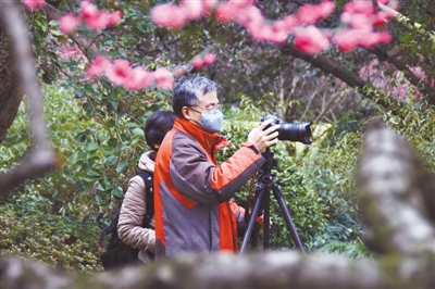 2月19日,游人在杭州植物园拍摄梅花。当日起,杭州西湖风景名胜区所属公园景点有序开放。为确保安全,景区将进行实时游客量控制,并要求所有游客佩戴口罩参观游览。
