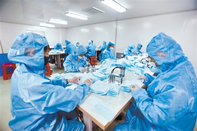 24日,在连城工业园区龙岩市洁尔奇新型材料有限公司,工人们在操作半自动化生产设备,一包包一次性医用口罩被试生产出来。洁尔奇口罩生产项目是连城引进的泉州客商投资项目,总投资3500万元,一期建设规模为日产一次性平面口罩25万个、N95口罩10万个,从4日签约到21日试生产仅用17天时间。