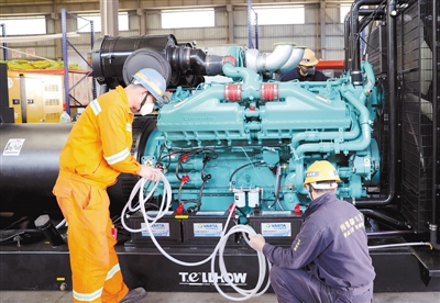 为保障应急产品供应,泰豪·海德馨汽车公司于2月11日起复工,截至昨日,已有在岗人员178人。该公司制订疫情防控方案,每天对所有员工进行健康监测,建立员工健康档案,在岗人员全部健康。图为昨日上午,工人正在检验1000千瓦柴油发电机组物料。 记者 郭亦斌 黄俊 通讯员 温连光 摄