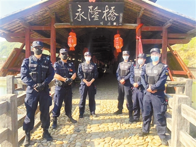 为继续加强疫情防控,连城县莒溪镇璧洲村取消传承数百年之久的农历二月初二灯笼节,并劝导、谢绝外乡外村人员到璧洲村聚会、聚餐。该镇组织镇村干部和县公安局巡特警到璧洲村布控,例行巡逻,确保防控到位。图为2月23日璧洲村古建筑永隆桥旁巡逻的连城县巡特警人员。记 者 傅长盛