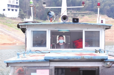 2月27日,工作人员项然登在驾驶渡船。目前正值春耕生产,为了方便茶农到库区茶园生产,福建省福鼎市桐山街道古岭村党员突击队与南溪水库渡船管理站联防联控,逐步恢复因疫情防控停运的渡船运输。据了解,福鼎市南溪水库渡口是一项惠民工程,已为乘客提供义渡服务近40年。