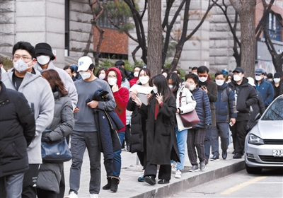 3月3日,人们在韩国首尔街头排队购买口罩。韩国疾病管理本部3日发布的最新统计数据显示,韩国新增600例新冠病毒感染病例,累计确诊病例增至4812例。