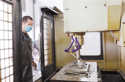 位于永定区坎市镇的业兴机械制造有限公司是一家以生产加工车床件、机加件为主的企业,于2月11日复工复产,目前返岗人数超90%,产能恢复80%左右。图为近日,工人操作数控设备加工部件的场景。