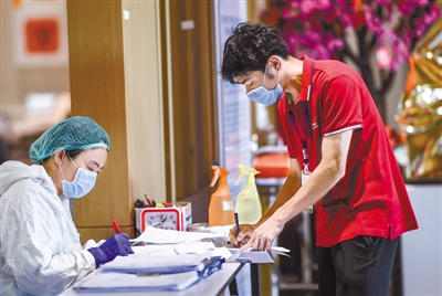 3月8日,心理疏导工作者莫杨宝(右)在海口市美兰区一处医学集中隔离观察点了解留观人员状况。近日,记者探访了海南省海口市多处医学集中隔离观察点的心理疏导工作者。他们是海口市卫健委抽调的心理咨询师和心理健康工作者,在各医学集中隔离观察点驻点值班,为留观人员、医护人员等提供心理健康服务,开展必要的心理干预。此外,心理疏导工作者还积极与留观人员和观察点其他工作人员沟通,促进双方相互理解和相关问题解决,助力疫情防控。 新华社 发