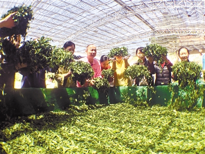 4月17日,漳平永福台湾农民创业园滕王生态农场的高山茶开始采茶制茶。茶场从台湾台中市聘请来了有独特制茶工艺的叶瑞绵师傅,制作暖茶。图为叶师傅 (水红上衣者)带着徒弟们唱着台湾祝福歌谣,开始茶叶“浪青”工艺。