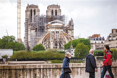 4月27日,在法国巴黎,行人经过巴黎圣母院附近。受新冠疫情影响而暂停的巴黎圣母院修复工程于27日起逐渐恢复。