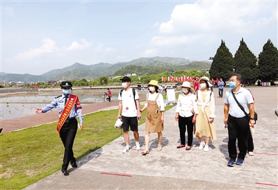 上杭县公安局古田派出所女警巡逻服务队成立于2010年,现有队员10人,平均年龄28岁,肩负着护校安园、调解帮扶、防范宣传、人口登记、法治宣传、维护权益、秩序维护、救助服务、义务讲解等职责。图为4日,女警巡逻服务队员陈燕芳为游客义务讲解。